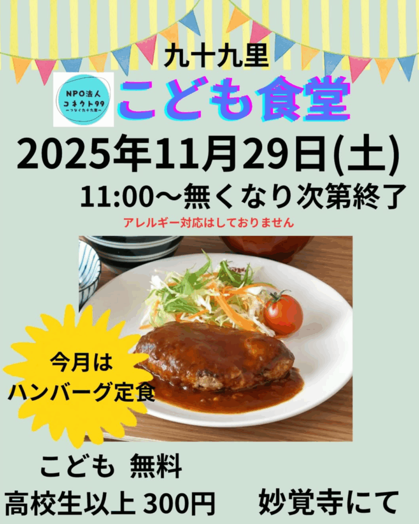 2025年11月のこども食堂は11/29(土)!メニュー「ハンバーグ定食」です!